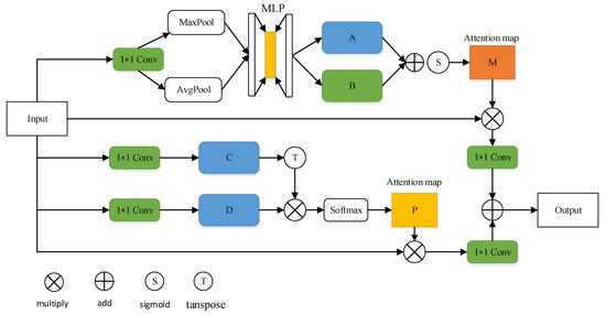 In the channel attention module, the dimensionality is first reduced by 1 × 1 convolution, and then the input spatial information is aggregated by Avgpool and Maxpool. Afterwards, through the multi-layer perceptron MLP, two spatial context features, representing A and B, are obtained. Finally, the two features are summed element-by-element to merge, and the corresponding channel attention diagram M is calculated, as shown in Equation (1):