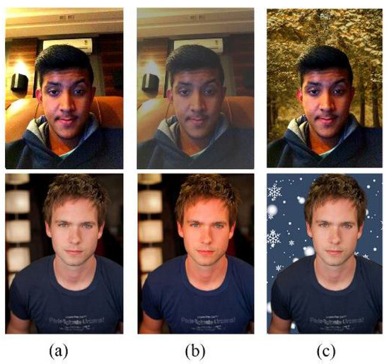 Since the image in the initial dataset cannot fully simulate the complex background, exposure, weather and other factors in the portrait image in the actual scene, this paper will use data enhancement to expand the data volume, mainly by synthesizing the foreground object in the actual image onto the new background. It mainly includes image color adjustment (contrast adjustment and brightness adjustment) {0.5, 1.5}. Image background replacement (weather effects randomly add {rain, snow, clouds, sunshine} and seasonal background replacement {spring, summer, autumn, winter}). The effect is shown in Figure 6.