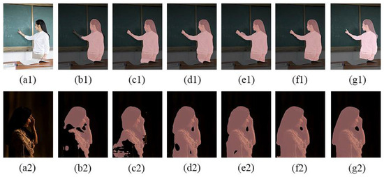It can be seen that the U-net model loses the target portrait in Figure 7(a1,a2). The segmentation effect of LinkNet and PortraitNet is better than that of U-net, but in both Figure 7(c1,d1), at the point of contact between the portrait and the table, some degree of mis-segmentation of the background being categorized as portrait semantics occurs. Still worse, in the low-light scenes of Figure 7(c2,d2), both show the more obvious phenomenon of portraits being misjudged as backgrounds. Deeplab v3+ in Figure 7(e1) has basically completed a good segmentation of portraits, but in the edge details of portraits such as arms, the accuracy still needs to be improved. Meanwhile, in Figure 7(e2) of the low-light scene, there is still a certain phenomenon of portrait loss. In Figure 7(f1,f2), Trans UNet can perform a good segmentation of the target portrait. However, it still appears in the background misjudgment in the lower left corner of the portrait in the dark scene in Figure 7(f2). Compared with other semantic segmentation models, the proposed model in this paper has better segmentation accuracy of edge details, such as the right sleeve and fingers in Figure 7(g1). In Figure 7(g2), in the low-light scene, the portrait preservation is the most complete, and the background discrimination, such as the gap between the arm and the body, is closer to the standard segmentation results than other semantic segmentation models, and the segmentation accuracy is the best.