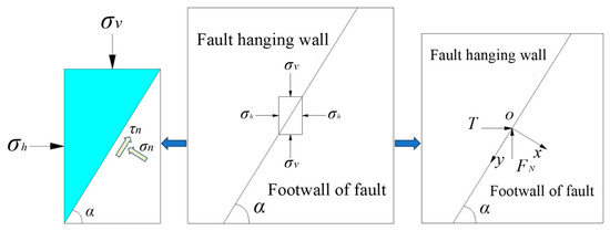 Meanwhile, a macroscopic mechanical instability model of the fault was obtained; the mechanical model of the fault is shown in Figure 2. The support stress FN and horizontal stress T on the fault plane are decomposed along the fault: