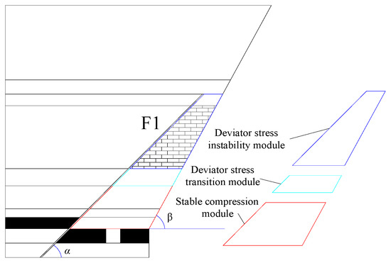 According to the above functional relationship, it can be seen that when the dip angle of the fault is smaller than the movement angle of each rock layer, as the height increases, the width of the boundary modules of different rock layers gradually decreases. At the same time, the center of gravity of the boundary rock mass gradually shifts to the goaf. The ability of the boundary modules to resist deformation is poorer, the stability is lower, and the possibility of movement deformation is greater. The partition of discontinuous-boundary support modules is shown in Figure 6. In the Figure, α is the fault dip angle, in °; β is the span angle of the lower rock mass of the key stratum, in °.