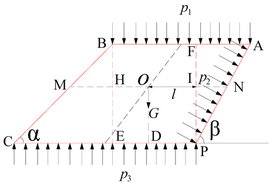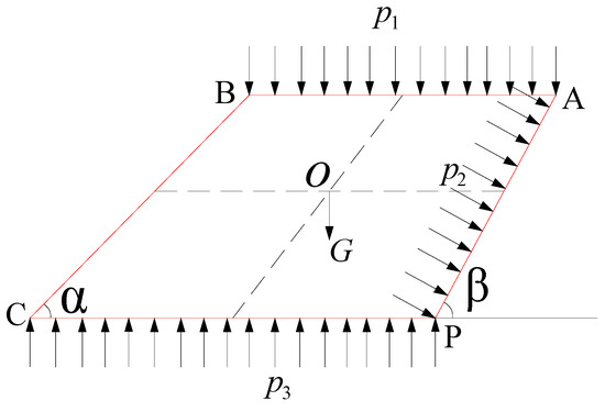 The moment analysis is carried out with point P as the rotation center; the force is positive when the object rotates counterclockwise around the center of the moment, and vice versa. Therefore, when the sum of the moments of each force to point P is positive, the rock mass rotates around point P. The key stratum support module offset instability model is shown in Figure 8.