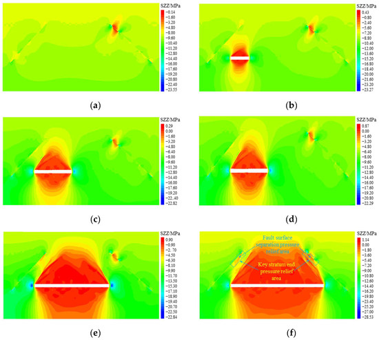 As shown in Figure 14 and Figure 15, as the advancing distance increases, the suspended area of the goaf gradually increases, and the supporting area of the lower part of the rock layer on the inner side of the fault zone decreases, leading to the occurrence of pressure-relief zones and stress-concentration zones in the surrounding rock of the fault zone. According to Figure 15a,b, it can be seen that the vertical stress at measurement point A of the surrounding rock in the upper part of the fault zone has decreased from 8.76 to 4.88 MPa, and the vertical stress at measurement point B has decreased from 8.41 to 3.14 MPa. The monitoring results indicate that as the working face advances, the vertical stress in the hanging-wall area of the fault zone decreases, and a pressure-relief zone appears in the upper part of the fault zone. From Figure 15c, it can be seen that the vertical stress value of measuring point C in the middle of the fault zone changes from 8.76 to 5.53 to 6.19 to 5.53 MPa. The vertical stress value of this measuring point undergoes a process of decreasing, then rising, then decreasing. The stress decrease is caused by the activation of the upper fault surrounding rock, and the intermediate stress-increase stage is caused by the increase in the advanced support pressure of the working face. The overall vertical stress shows a downward trend. According to Figure 15d, it can be seen that the vertical stress value of measuring point D in the middle of the fault zone changes from 7.09 to 5.63 to 9.52 MPa. The vertical stress value of this measuring point undergoes a process of decreasing and increasing. The stress decrease is caused by the activation of the upper fault’s surrounding rock, and the later stage of stress increase is caused by the increase in advanced support pressure of the working face. According to Figure 15e,f, it can be seen that the vertical stress at measuring point M in the upper surrounding rock of the fault zone increases from 7.65 to 13.12 MPa, and the vertical stress at measuring point N increases from 14 to 19.67 MPa. The monitoring results indicate that as the working face advances, the vertical stress in the footwall area of the fault zone shows a decreasing trend, and a stress-concentration area appears in the lower part of the fault zone.