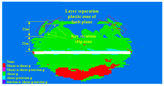 As shown in Figure 12a,b, with the continuous advancement of the working face, the pressure-relief zone at the upper end of the F1 fault gradually increases. When the rock movement line at the front end of the working face intersects with the F2 fault plane, the area of the pressure-relief zone at the upper end of the F2 fault suddenly increases. The pressure relief areas of F1 and F2 faults are located in the key strata, indicating that the fault is activated at the key position, and the results of the theoretical model are verified. The discontinuous boundary of the working face separates the stress transmission of the surrounding rock, and the activation of faults changes the movement pattern of the overlying rock in the mining area. The stress-concentration area of the surrounding rock in the working face is mainly distributed in the hanging-wall area of the fault and near the boundary protection coal pillars. The maximum stress is mainly distributed in the middle of the boundary-protection coal pillar and the lower part of the fault. As shown in Figure 13, the plastic zone of the end module of the critical layer at the discontinuous boundary is mainly distributed on the adjacent fault plane, as well as the upper and lower contact surfaces of the critical-layer boundary module. The distribution of the plastic zone and pressure-relief zone indicates that the key layer has experienced slip and deflection near both ends of the fault plane, forming an unstable spatial structure. Therefore, the numerical simulation results and the theoretical calculation results are mutually validating.