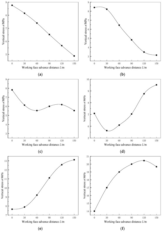 Vertical stress distribution of rock strata in goaf with discontinuous boundary. (a) Working face advancing 0 m. (b) Working face advancing 30 m. (c) Working face advancing 60 m. (d) Working face advancing 90 m. (e) Working face advancing 120 m. (f) Working face advancing 150 m.