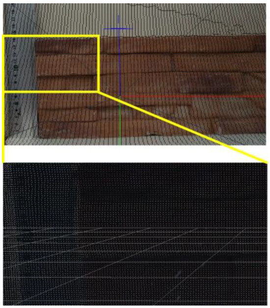 Human haptics can perceive diverse textures owing to the micrometer-level variations in roughness of a target surface [11,12]. Research on the effects of touch, such as attention training using tactile feedback, has also been conducted [13]. Thus, the point cloud density used for 3D model generation should preferably reflect the same order of roughness. However, the current laser surveying instruments record measurements from distances of several tens of meters or more and provide point cloud information spaced in units of millimeters (Figure 1). Also, the smallest unit of coordinate information is generally millimeters. There are surveying instruments that can identify roughness in the order of microns, but these are for surveying very small areas or samples that can be placed on top of the instrument and cannot be used to survey large structures (such as bridges).