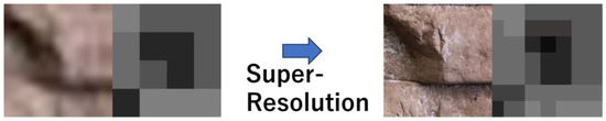 As a super-resolution method using deep learning, SRCNN [29] was first proposed by Dong et al. Although this method was a simple model consisting of three convolution layers, it set a state-of-the-art record at the time of publication. Kim et al. proposed VDSR [30], which solves the problems of the training speed and the single resolution of generated images in SRCNN. Dong et al. also proposed FSRNN [31], which solves the computational cost and processing speed problems of SRCNN. As a GAN-based super-resolution method, Ledig et al. proposed SRGAN [32] using a ResNet-based generator, which can generate more precise images than previous methods. Wang et al. improved the generator, classifier, and loss function of SRGAN and proposed ESRGAN [33], which produces more precise images with smaller fluctuations. In this paper, we use Real-ESRGAN [34], which improves on ESRGAN’s dataset and model structure to better the generalization performance.