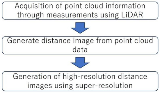 In this study, a high-resolution distance image is generated using a GAN-based super-resolution method (Figure 3). This image is generated from a low-resolution distance image generated from sparse point cloud information. The accuracy of the generated images is evaluated by distance images generated at different resolutions for the test object.