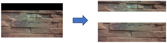 In this study, measurements were made at a distance of approximately 200 mm from the test specimen. An Intel L515 LiDAR camera was used for the measurements, and the measurement distance was an average of 50 acquisitions. As shown in Figure 4, the specimens to be photographed had large differences in unevenness, with the closest distance measured at approximately 202 mm and the farthest distance at approximately 227 mm. The minimum distance specified in the product specifications is 25 cm. However, in this paper, measurements were conducted at the actual measurable limit distance in order to obtain point cloud data with the highest possible density. In the evaluation, the distance image was a monochrome image, and the pixel values of the distance image represented the acquired distance information in mm. Figure 5 shows the distance image. To train the model, distance images were acquired at a resolution of 1280 pixels in height and 720 pixels in width. Due to the effective range of LiDAR, the upper 160 pixels and the rightmost 30 pixels are where the background is reflected. These areas have a far distance and different features from the specimens and would usually be the noise used to train model. Thus, we deleted these areas from the image data in this paper. The upper 200 × 1250 pixels were divided into an evaluation area and the lower 360 × 1250 pixels into a training area (Figure 6). The image of the training area was further divided into 100 square images of 256 pixels with an overlap of 10 pixels vertically and 100 pixels horizontally. Low-resolution images were generated from the segmented images at 0.75×, 0.5×, and 0.33× magnifications, respectively, for a total of 400 images to be used as the training dataset. In addition, as data for evaluation, low-resolution images with 0.5× and 0.25× magnifications of the data divided into regions for evaluation were created.