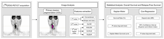 New cancer treatment techniques are currently being studied to improve patient survival [34,35,36]. However, the same technique may have different results in patients diagnosed with the same cancer. For this reason, studying the possible therapeutic strategies based on the clinical and image characteristics of the patient at the time of diagnosis is a matter of great importance. In this study, cancer lesions from [18F]FDG PET/CT images of patients with oropharyngeal cancer are analyzed to assess the predictive value of clinical, quantitative, and textural features, assessing OS and RFS over a 2-year follow-up period. Concretely, 48 parameters are extracted, including 13 conventional parameters, 4 shape and size features, and 31 textural features. Kaplan–Meier curves and Cox proportional hazards regression analyses are computed.
