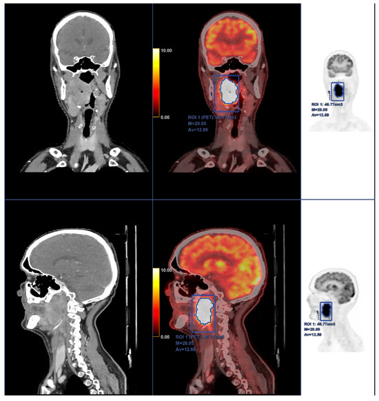 Despite its high incidence, the survival rate has been increasing in recent years due to early diagnosis and the improvement in therapeutic strategies [1]. Functional images using Positron Emission Tomography (PET) with 18F-2-fluorine-2-deoxy-D-glucose ([18F]FDG) in combination with computed tomography (CT) are a useful tool to assess the recurrence before the treatment or in the case of relapse thanks to the high negative predictive value [1], especially during the first two years post-treatment due to the high risk of relapse (50–60%) [5,6] in locoregional advanced oropharyngeal cancer (stage III or IV). [18F]FDG PET/CT images help to evaluate efficiently the changes produced in tissues after therapies and treatments, discriminating between active residual disease, recurrent disease, and post-treatment fibrosis. As a result of such high levels of sensibility and specificity, PET-CT findings lead to a change in management for up to 25% of patients [7,8,9].