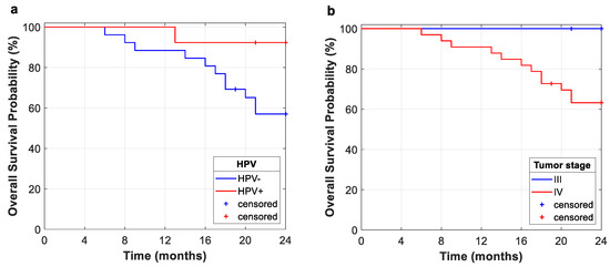 The 2-year OS was 69% for the entire study cohort. Results of OS univariate Kaplan–Meier analyses of clinical characteristics and image features are summarized in Table 2 and Figure 3. For Kaplan–Meier analysis, HPV-positive (SR: 92.3%) showed a better prognosis of OS than HPV-negative (SR: 57%; p = 0.037). In the same way, cases with TLG (p = 0.029) lower than the optimal cut-off resulted in a higher survival rate (SR: 82.4%) compared to the high-value subgroup (SR: 50%). However, results were not statistically significant after multiple-testing correction. OS curves are shown for clinical characteristics and SUVmax in Figure 3.