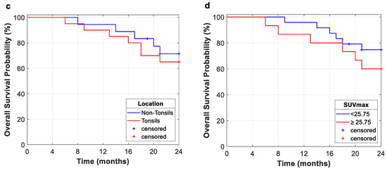 Kaplan-Meier curves of OS analysis for 2-year follow-up. Relevant clinical features are shown. (a): HPV; (b): tumor stage; (c): tumor location; (d): SUVmax. The Kaplan-Meier curve for smokers is not included due to the lack of representativeness of the non-smoker group.