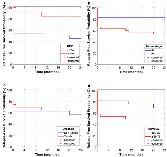 Kaplan-Meier curves of RFS for 2-year follow-up. Relevant clinical features are shown. (a): HPV; (b): tumor stage; (c): tumor location; (d): SUVmax. The Kaplan-Meier curve for smokers is not included due to the lack of representativeness of the non-smoker group.