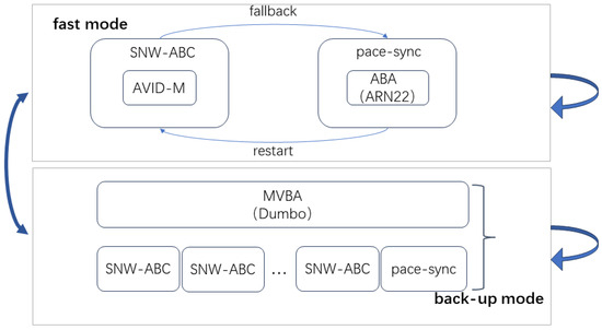 As shown in Algorithm 3, the back-up mode protocol consists of two modules running in parallel. The first module provides the primary functionality of the back-up mode protocol, enabling it to operate successfully and produce blocks in adverse network conditions, serving as the ABC module. The second module, considering algorithm reusability, comprises the snw-ABC and pace synchronization introduced in the fast mode protocol, ensuring that even in the presence of favorable networks, it competes for block output.