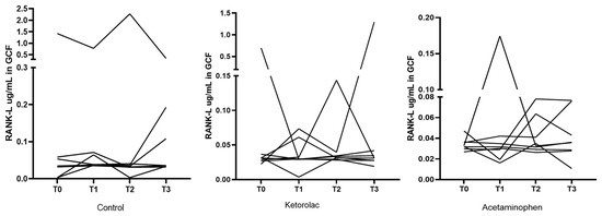 RANK-L levels during the 5 days of the study. The data are graphically depicted through lines and vertices, illustrating the RANK-L values for each patient across the four sampling time points for each sampling time of the three study groups. A Kruskal–Wallis test was performed to identify any difference between RANK-L levels throughout the study. GCF: gingival crevicular fluid. T0: basal; T1: 24 h; T2: 48 h; and T3: 5 days.