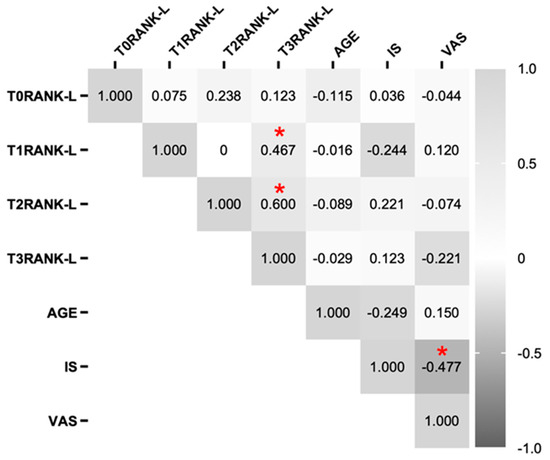 A Spearman correlation was performed between RANK-L concentrations, age, interproximal space, and pain (with the VAS scale) at the different times of sampling and a positive correlation was observed between RANK-L at 24 h (T1) and 48 h (T2) (r = 0.467, p = 0.025), as well as a positive correlation between RANK-L at 48 h (T2) and 5 days (T3) (r = 0.600, p = 0.002). In contrast, a negative correlation was identified between the interproximal space and the VAS pain scale (r = −0.477 p= 0.019) (Figure 3).