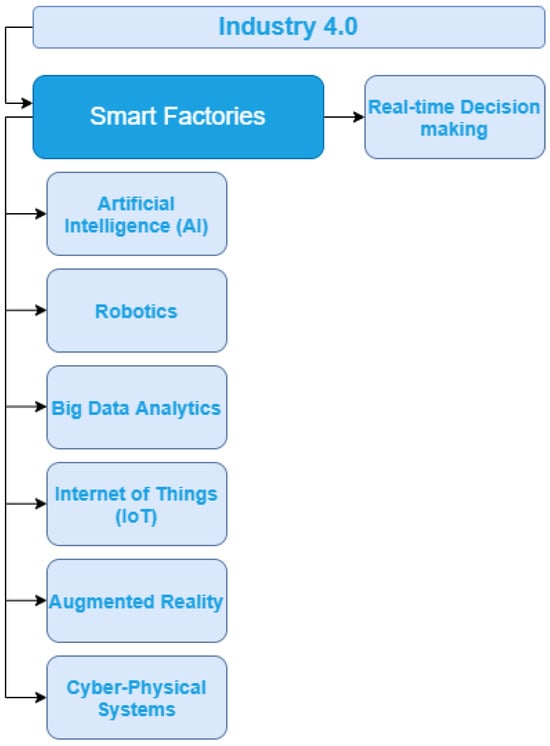 Industry 4.0, the fourth industrial revolution which is strongly tied to the Internet of Things (IoT), cloud computing, big data analytics, and other technologies as mentioned in Figure 1, was developed around the concept of smart factories, i.e., a manufacturing unit where different process are linked vertically and horizontally [3]. The concept of smart factories, which is the key element in Industry 4.0, focuses on the utilization of artificial intelligence (AI), IoT, and robotics to enhance productivity, optimization, efficiency, and quality of operations. Machines are interconnected with each other to communicate with a central control system, which ensures real-time monitoring and decision-making in the smart factories of Industry 4.0 [4].
