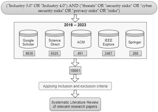 A systematic literature review (SLR) was carried out for this study to thoroughly evaluate pertinent papers related to Industry 4.0 and Industry 5.0, with a particular emphasis on related risks and threats. (“Industry 5.0” OR “Industry 4.0” AND “threats” OR “security risks” OR “cybersecurity risks” OR “privacy risks” OR “risks”) was the search query used to find relevant research publications. The academic works published as journal articles, conference papers, or book chapters between 2018 and 2023 were included in the inclusion criteria. To include the most current and pertinent contributions to the subject, the review’s scope was restricted to this time frame. In contrast, studies not directly relevant to Industry 5.0 and 4.0 or not addressing the risks and threats associated with them were filtered out using exclusion criteria. Moreover, research not written in English and those whose whole texts were unavailable were not included. The advantage of this SLR is that it offers a thorough understanding of the state of the art when it comes to the threats and risks related to Industry 5.0. This helps practitioners, researchers, and decision-makers to improve cybersecurity and minimize possible risks in the changing industrial landscape.