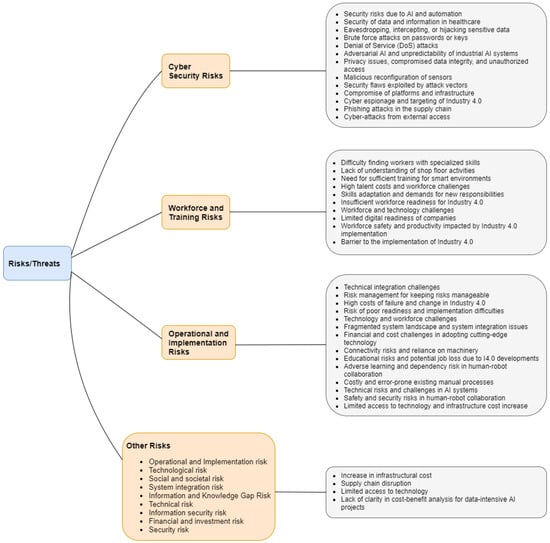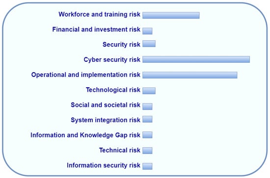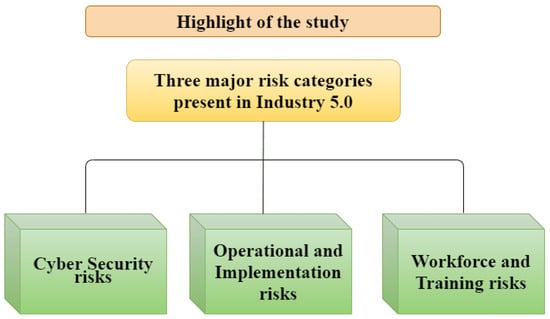 Following the completion of the systematic literature review, it is evident from Figure 7, which represents Table 5 that the risks related to Industry 4.0 and Industry 5.0 may be divided into three main categories: cybersecurity risk, operational and implementation risk, and workforce and training risk. Although there are more risk categories, these three are the most common. Knowing these three key risk categories is essential to moving the discussion along.