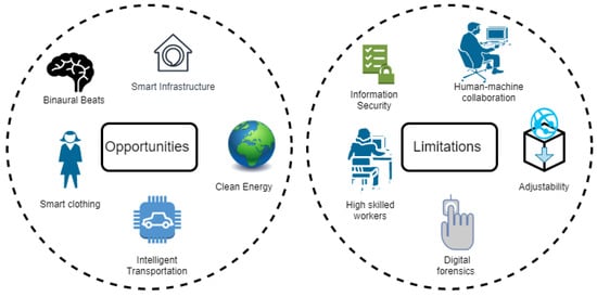 Technology’s acceptance and technological trust are essential. People who use the new technologies are being trained at the same time as technology is being adapted to humans. Security, privacy, a lack of skilled staff, a drawn-out process, and a high price demand are the present problems. Industry 5.0 adoption is required to work with smart machines and cobots and adhere to industrial standards and laws. The three future directions for Industry 5.0 are quantum computing, cognitive computing, and human–machine interaction [9]. The installation phase of the technologies brought by Industry 5.0 is still ongoing. The literature research reveals their advantages over Industry 4.0; however, it does not mention any potential future difficulties. As a result, it is challenging to research the constraints and difficulties presented by Industry 5.0 technologies. Future research can be done to identify the difficulties Industry 5.0 technologies encounter and produce a workable solution [34].