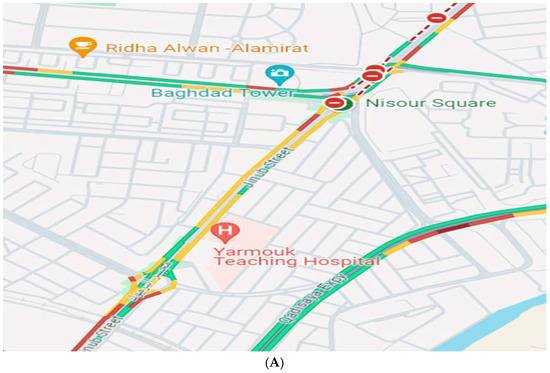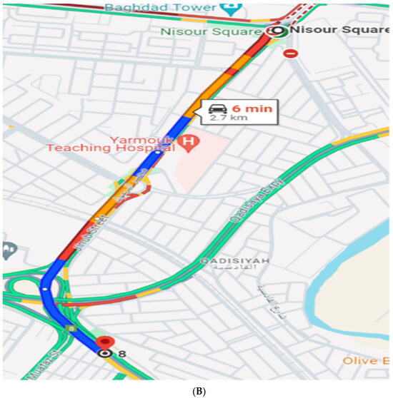 This work is focused on a highway road and a residential road, with a focus on vehicles. Figure 1A,B depict a map of a significant road in Baghdad that connects the provinces in the southwest to the city center. Residents of the area complain of heavy traffic on a continuous basis. The study focuses on a segment of this road that runs between points A and B. Point A consists of an intersection of four legs. Two of these lanes lead to point B, one of which passes through the residential area, spanning 2.6 km in distance. It takes a vehicle approximately 4 min to cover this distance on the highway. In contrast, the same vehicle only takes 3 min to traverse the residential road, which is relatively short, as per Google Maps. The city suffers from high levels of pollution due to population growth over the past years, with a population of 9 million people. By focusing on traffic routing conditions, for example, eco-driving and eco-routing, governments seek to reduce the generation of pollutants and energy use by reducing traffic congestion and improving other factors [22]. Therefore, there has been a need to conduct more relevant research to improve the level of air quality. We propose a simulation model to study how to improve the level of air quality in residential areas by diverting vehicles outside the area at peak times and use the results of this simulation in order to generalize them to all regions.