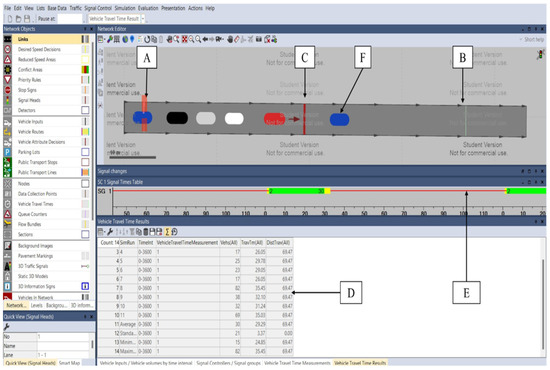 Basic parameters (A: vehicle input start; B: vehicle input end; C: signal heads; D: vehicle travel time results; E: signal times table windows; F: vehicle).
