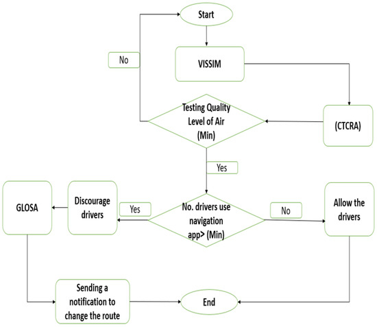 The algorithm controlling traffic congestion in residential areas (CTCRA) is shown in Figure 4, which was developed. To implement the algorithm in a simulation environment like VISSIM, the algorithm collects information about all drivers (vehicles) who communicate with navigation applications and plan to take a shortcut through the residential area. The algorithm determines a range of air quality levels (pollution levels) within the residential area, which, if the minimum of these levels is reached, will allow the driver to take a shortened route (this limit is often outside peak times). Therefore, the algorithm only affects vehicles that intend to take the shortened route at peak time.