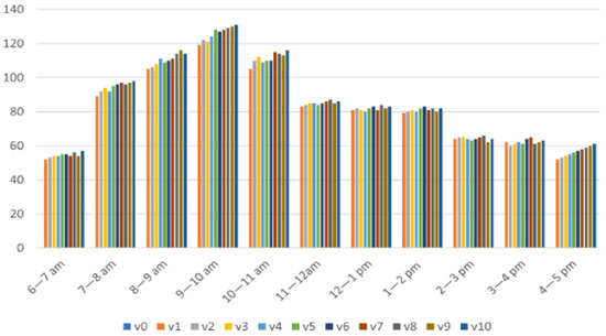 Figure 6 shows the simulation results for the variant (v0), which represents the actual case, while the other parts of (v) represent the 10% increase from (v0) for each variant (vehicles). Therefore, when referring to Figure 2 (the actual state), we notice that the important changes are with the increase in the percentage of the variant (v0) when it is 25%, as previously determined during peak hours.