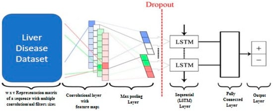 Figure 4 demonstrates the details of the proposed CNN and LSTM models. The suggested model integrates the capabilities of LSTM and CNN in order to effectively identify liver illness. By virtue of its training on the Kaggle dataset, the system is capable of generating accurate and prompt diagnoses. Additionally, it aids in improving the overall quality and effectively managing other components associated with the system.
