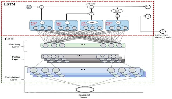 symbol. The LSTM network works as another part of the DL model, which is comprised of memory blocks, or a collection of subnets that are usually connected. Memory blocks consist of an output gate, an input gate, a forget gate, and a memory cell. In contrast to the conventional recurrent unit, which updates its contents at each iteration, the LSTM unit utilizes the introduced gates to determine whether or not to retain the existing memory. LSTM explicitly avoids the long-term dependency conundrum. In contrast to the solitary neural network layer found in recurrent neural networks, the LSTM architecture comprises four interconnected layers. The structure of LSTM is wherein each line represents a complete vector connecting the output of one node to the inputs of the other.