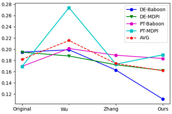 35] between the DCT detection result of the marked image and the DCT detection result of the ground-truth image, with the lower value of the metric being better.