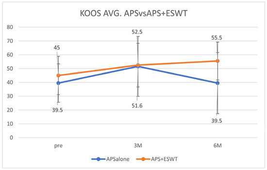 The average KOOS values were 39.5 ± 11.5 before the APS therapy, 51.6 ± 20.8 after 3 months, and 39.5 ± 20.5 after 6 months in the A-alone group. In contrast, in the A + E group, the values were 45.0 ± 12.7 before the APS therapy, 52.5 ± 15.3 at 3 months, and 55.5 ± 13.2 after 6 months. The average KOOS decreased from 3 to 6 months in the A-alone group but increased in the A + E group (Figure 1).