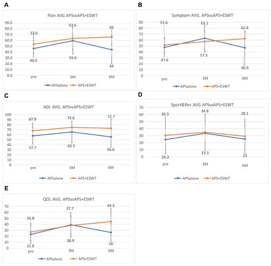 The average KOOS subscores in the APS and APS + ESWT groups: (A) pain, (B) other symptoms, (C) activities of daily living (ADL), (D) sports and recreation, and (E) quality of life (QOL). APS, autologous protein solution; AVG, average; ESWT, extracorporeal shock wave therapy. Most KOOS subscores decreased from 3 months to 6 months in the A-alone group but increased in the A + E group.