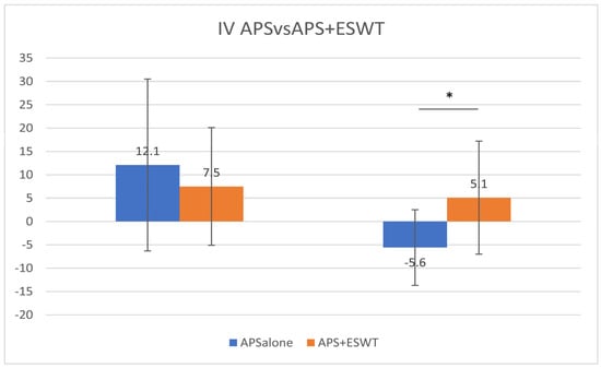 Mean improvement in the KOOSs between APS and APS + ESWT groups. The mean improvement value (IV) at Pre-3M showed no significant difference between the two groups; however, the mean IV at 3–6M showed a significant difference between the two groups * p < 0.05). KOOS, Knee Injury and Osteoarthritis Outcome Score; APS, autologous protein solution; ESWT, extracorporeal shock wave therapy; Pre-3M, before 3 months; 3–6M, from 3 to 6 months.