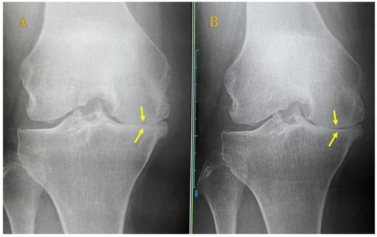 Radiography findings in the Rosenberg view showing KL4 medial knee OA in a 64-year-old female patient. (A) Joint space before APS. (B) Joint space is expanded 48 months after APS + ESWT. APS, autologous protein solution; ESWT, extracorporeal shock wave therapy; KL, Kellgren–Lawrence classification; OA, osteoarthritis.