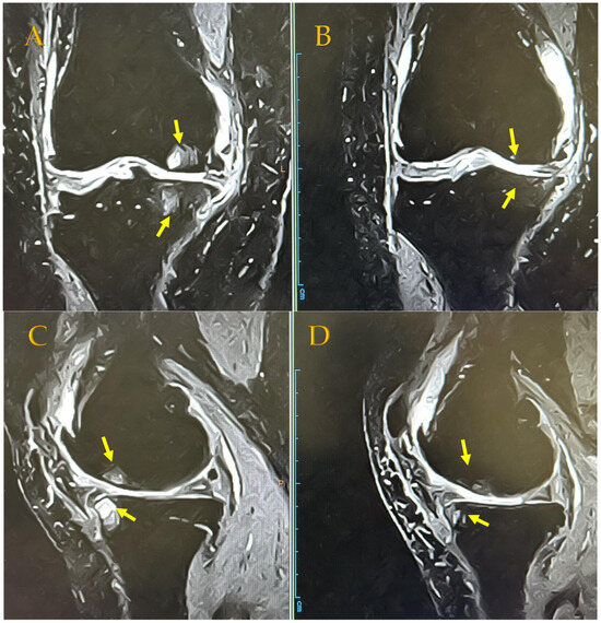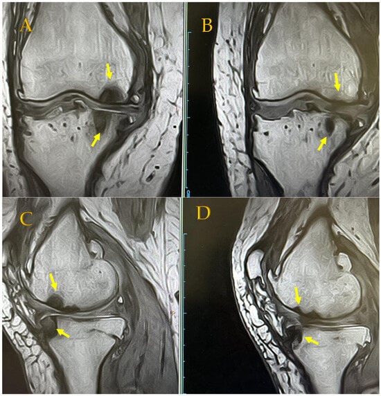 MRI findings of a KL4 64-year-old female patient. (A) BML and SBC on medial condyle Pre-APS therapy. (B) In T1 (upper photo), MRI after 4 years confirmed a reduction in BML, and in T2 (lower photo), the disappearance of bone cysts was confirmed. 8 October 2019 MRI T1 Pre-APS therapy (lt.) → 16 October 2023 MRI T1 4 years later after APS therapy (rt.); APS (31 October 2019) + ESWT 36 times (every 1–2 months) after APS therapy. (A) coronal view (18 October 2019) (B) coronal view (16 October 2023) (C) sagittal view (18 October 2019) (D) sagittal view (16 October 2023).