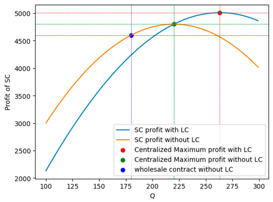 First, we consider a supply-chain system where LC effects are not considered. Here, we assume that the per-unit production cost remains constant at 30.0 (i.e., c = 30.0). (This corresponds to the average production cost when 220 items are produced in the system under learning-curve effects, i.e., ). In the centralized system without learning effects, we can derive the optimal production quantity () using expression (6): . The total expected supply-chain profit, calculated from Equation (3), is 4800. In a decentralized system with independent supply-chain members considering a wholesale contract (w = 40), the retailer’s optimal order quantity () is derived as follows: , resulting in the total expected supply-chain profit of 4600. The finding shows that the wholesale contract yields a supply-chain profit that falls short by 200 compared to the centralized system due to the double marginalization problem. To address the double marginalization problem in the decentralized system, a revenue-sharing contract can be adopted with appropriate parameters, wholesale price (w), and revenue-sharing ratio (ϕ). For example, if we set ϕ = 0.5 in the revenue-sharing contract, we can obtain w = 17.2 by the channel coordination relationship . With the revenue-sharing contract with parameters (w, ϕ) = (17.2, 0.5), it is possible to achieve the same overall optimal profit of 4800 as would be attained in a centralized decision-making scenario. In Figure 2, the orange-color curve shows supply-chain performance over different order quantities without the consideration of learning-curve effects. It is seen that the maximum supply-chain profit is realized when 220 products are ordered for the system under static production costs.