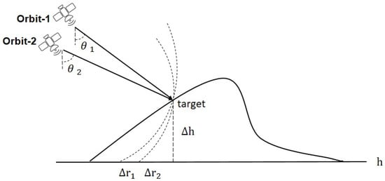 Due to the geometric characteristics of side view imaging of SAR image, its geometric positioning model has a higher correlation with elevation. As shown in Figure 3, according to the analysis of the SAR imaging geometric positioning model, the two SAR images to be matched were obtained from satellite SAR sensors at different incidence angles and , the relationship between relative positioning error of and error with elevation and the incident angle is: