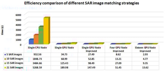 - When matching SAR images for a single node, the SAR–SIFT algorithm after GPU processing is nearly 96% higher than that of the single CPU node SAR–SIFT algorithm. After the improvement of the GPU algorithm, the performance of single-node GPU optimization algorithm is improved by 97%, which shows the effectiveness of the optimization strategy of the SAR–SIFT algorithm based on GPU mapping;
