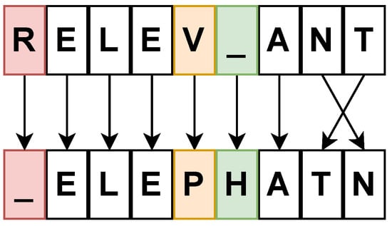 Consider two strings and (conveniently misspelled) and all costs . The minimal edit distance between these two strings can be identified by once performing each of the four supported edit operations, as shown in Figure 3, and is . The similarity score is determined by Equation (16) and is .