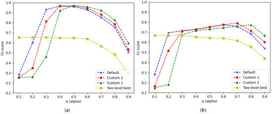 Table 3 lists the computed quality measures for the verse and epigram test sets in the second experiment. In each column, the highest value for each performance measure is highlighted in bold. Additionally, the F1-scores for verses and epigrams of the best performing similarity measure are also visualised in Figure 6a and Figure 6b, respectively.