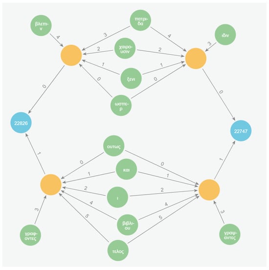 As the dataset in this example we have imported three groups of similar epigrams into the Neo4j graph database. The data are imported using the same method outlined in Section 6.2, and similarities are calculated with the default parameters. All three groups contain epigrams that are variations of the four-verse epigram presented in Table 4. A first group, with identifier 4245, comprises four-verse epigrams that feature minor deviations from the referenced epigram. The second group, with identifier 2150, primarily consists of three-verse epigrams representing variants of verses 1, 2 and 4 in Table 4, respectively. The last group, that has identifier 2148, contains two-verse epigrams that are variations of the first and last verse of the referenced epigram [52].