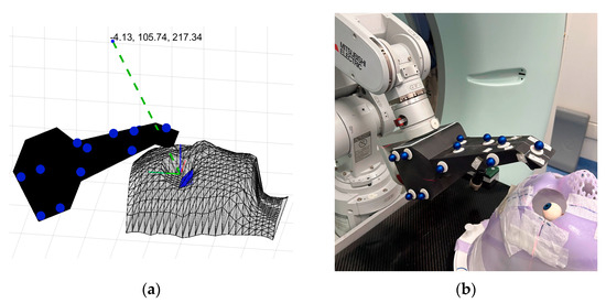 As already described (step 2 of the clinical treatment simulation workflow), the ETS alignment is performed by driving the robotic manipulator until the misalignment between the current ETS-mounted markers and the reference position detected by the OTS is minimized (Figure 7). The OTS detects the position of the ETS markers in real time and provides motion correction parameters (6 degrees of freedom (DOF)) for accurate alignment of the actual configuration against a predefined reference and indirectly of the fixation point to minimize misalignment between the ETS-mounted markers and the reference position detected by the OTS.
