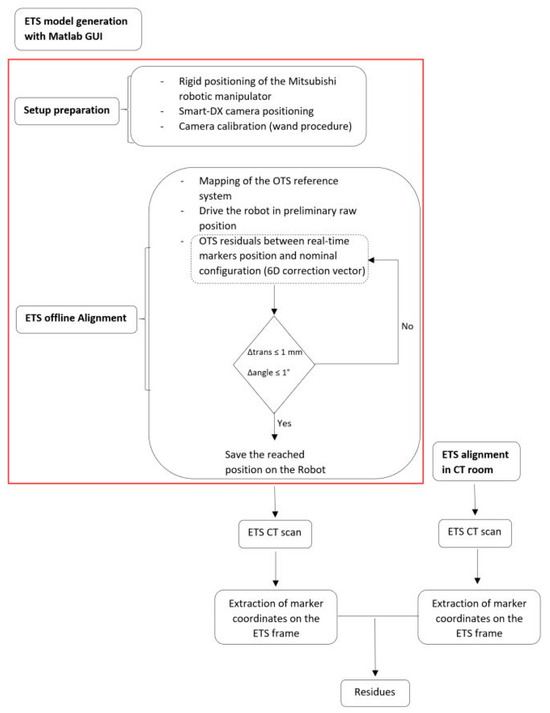 Workflow scheme—setup preparation and ETS position alignment with proposed method. Differences (highlighted in red box) between the current method in setup preparation and the use of a different OTS. To verify the accuracy between the two results, CT acquisition was performed to extract the coordinates of the center of radiopaque markers on the ETS surface for both configurations (standard method and proposed method).