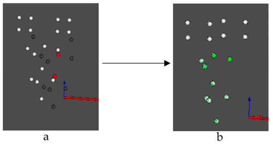 CNAO-OTS interface shows as white dots the nominal position of the markers and in dark gray the current position of the markers as detected by the OTS. A dark gray marker turns into red when the software is able to estimate the 6-DOF corrections required to bring it towards the desired position; a red marker becomes green when its distance to its homologous is smaller than 1 mm and 1 degree. The red, green (not visible) and blue arrows represent the room reference system. Panel (a) shows the beginning of the alignment procedure, while panel (b) shows the end of the procedure, after the application of iterative corrections using the robotic manipulator, with all physical markers aligned with their empirical reference position.