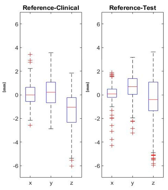 Boxplot of the differences between the reference and the clinically applied procedure, and between the reference and the proposed test procedure in the medio–lateral (x), antero–posterior (y) and cranio–caudal (z) directions.