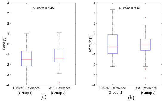 In the boxplot analysis (Figure 10), the median (IQR) values for Group 1 were −1.52° (IQR = 1.48°) for polar angles and −0.28° (IQR = 1.28°) for azimuthal angles, and for Group 2 −1.38° (IQR = 1.28°) and −0.11° (IQR = 1.08°) for the polar and azimuthal angles, respectively.