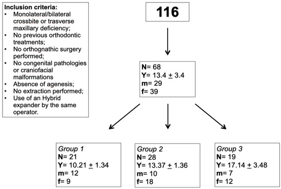 This study includes 116 initial patients, with ages ranging from 7 to 46 years (mean age 14.51 years). The criteria adopted for the inclusion in the study were as follows: the presence of maxillary transversal deficit; no previous orthodontic treatment; no orthognathic surgery performed; no extractions; absence of agenesis, congenital pathologies and cranio-maxillofacial malformations; use of a hybrid device for palatal expansion using two miniscrews placed in the anterior area of the palate; and a complete set of pre- and post-therapy models. Therapy was defined as treatment with maxillary expansion first and subsequent multi-bracket therapy.