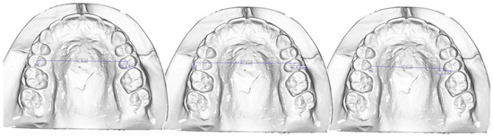 The measurements were performed by two operators. A sample of 10 patients was examined to detect the accuracy of the measurements. Both operators evaluated the cusp–cusp, centroid–centroid and lingual point–lingual point distances at the level of the first upper molars. The obtained values were compared to each other, using Pearson’s correlation index. A correlation index value equal to +1 indicates a perfect positive correlation. A correlation index equal to 0.998 was obtained.